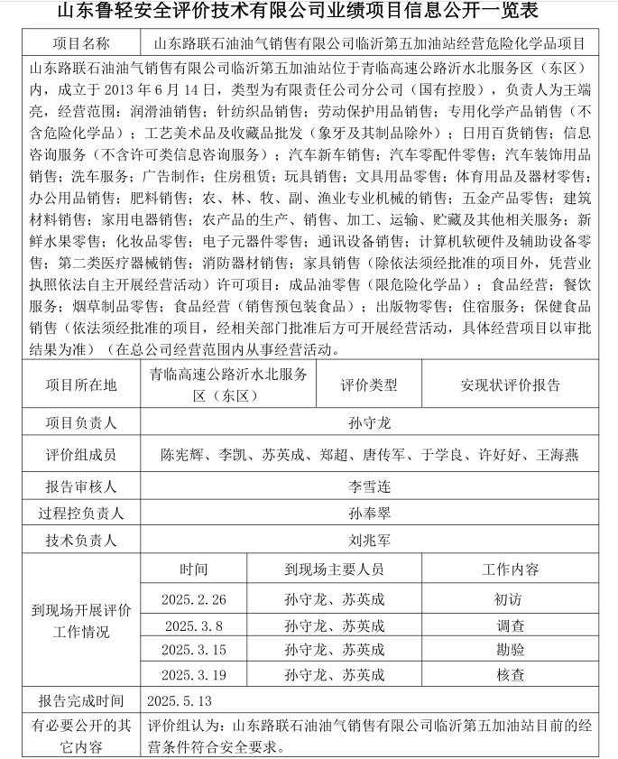 山東路聯石油油氣銷售有限公司臨沂第五加油站經營危險化學品項目